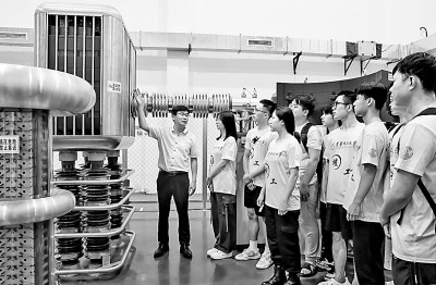 中國原子能科學(xué)研究院研究員在瑞昌核物理應(yīng)用研究院向?qū)W生們講解我國自主研發(fā)的AMS加速器。魏東升攝/光明圖片