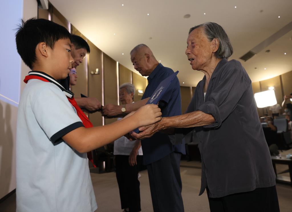 ↑2022年8月15日,在侵華日軍南京大屠殺遇難同胞紀(jì)念館,夏淑琴(右一)向曾外孫李玉瀚頒發(fā)“南京大屠殺歷史記憶傳承人”證書。新華社發(fā)