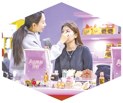 在上海舉辦的中國(guó)美容博覽會(huì)上,客商親身體驗(yàn)化妝。