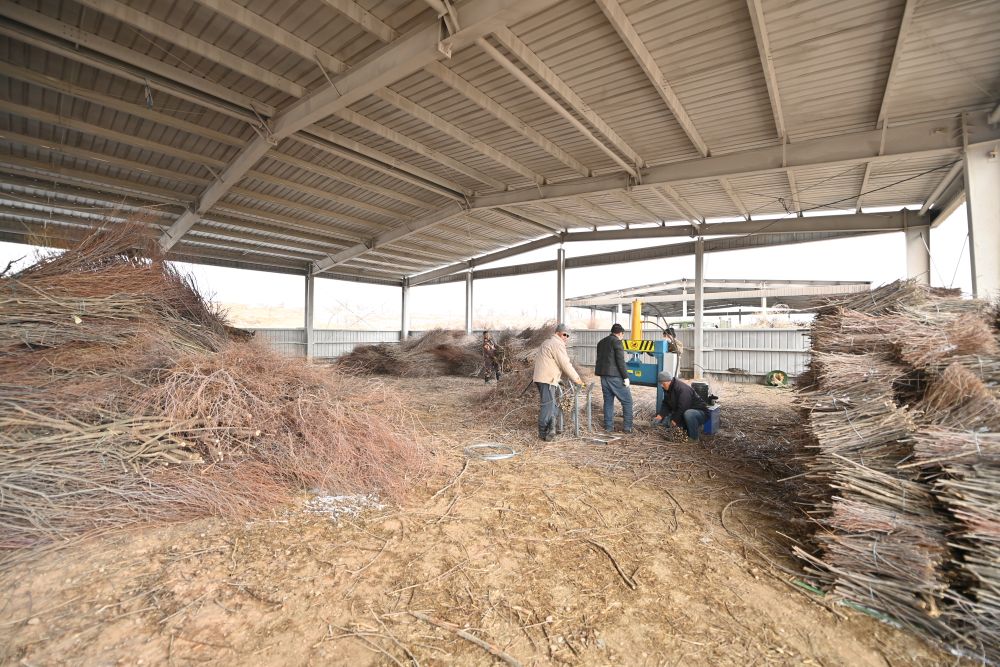 農(nóng)牧民們正在使用割灌機(jī)加工紅柳枝條。新華社記者 馬金瑞 攝