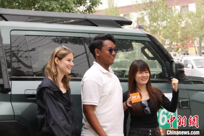 北京語言大學(xué)的留學(xué)生們?cè)诃h(huán)塔拉力賽事期間體驗(yàn)中國新能源車。賈志鵬 攝