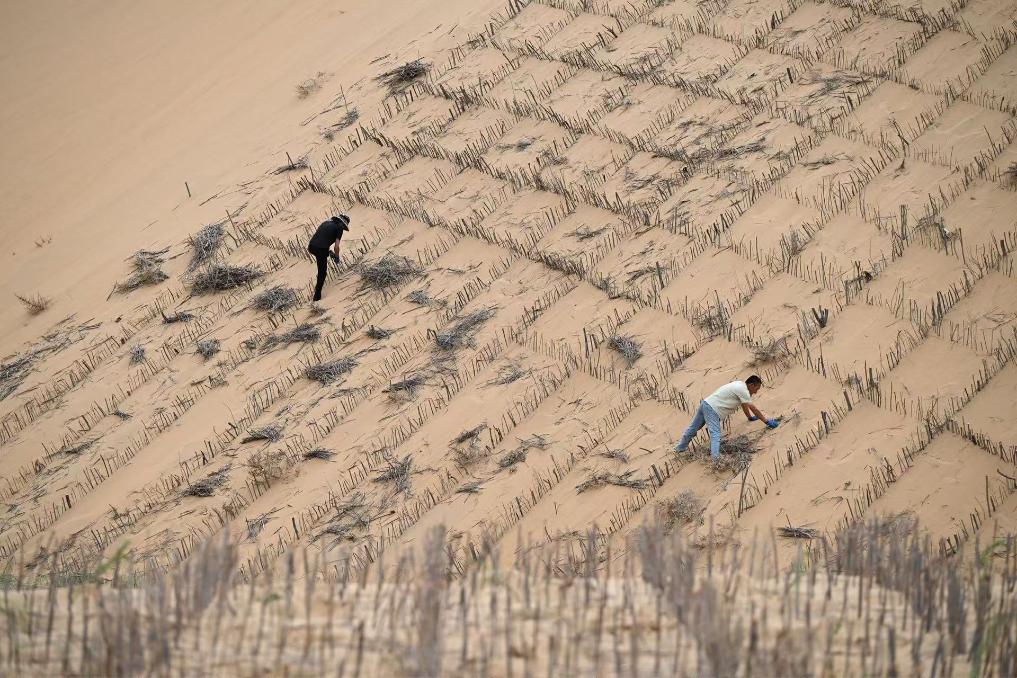 鄂爾多斯市達(dá)拉特旗農(nóng)民在防沙治沙項目區(qū)鋪設(shè)沙障。新華社發(fā)(楊耀中 攝)