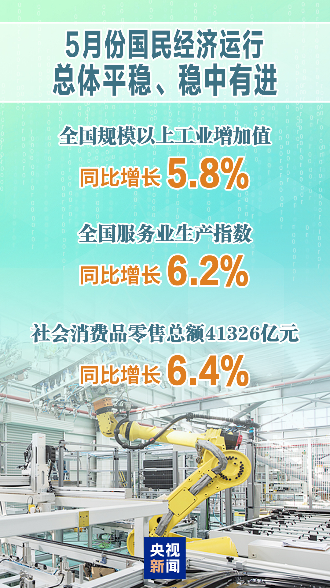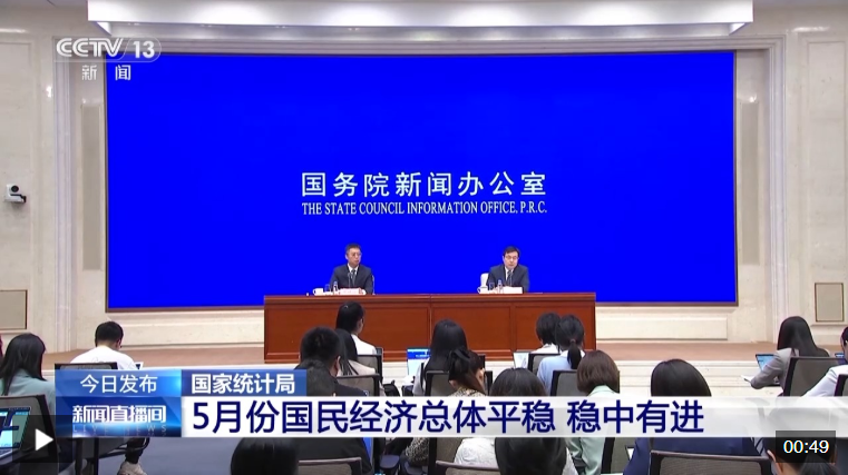 今天(6月16日)上午10時,國務(wù)院新聞辦召開新聞發(fā)布會,國家統(tǒng)計局介紹了5月份國民經(jīng)濟運行情況。相關(guān)負責(zé)人表示,隨著我國加緊實施更加積極有為的宏觀政策,5月份,國民經(jīng)濟頂住壓力平穩(wěn)運行,生產(chǎn)需求穩(wěn)定增長,就業(yè)形勢總體穩(wěn)定,新動能成長壯大,高質(zhì)量發(fā)展向優(yōu)向新。