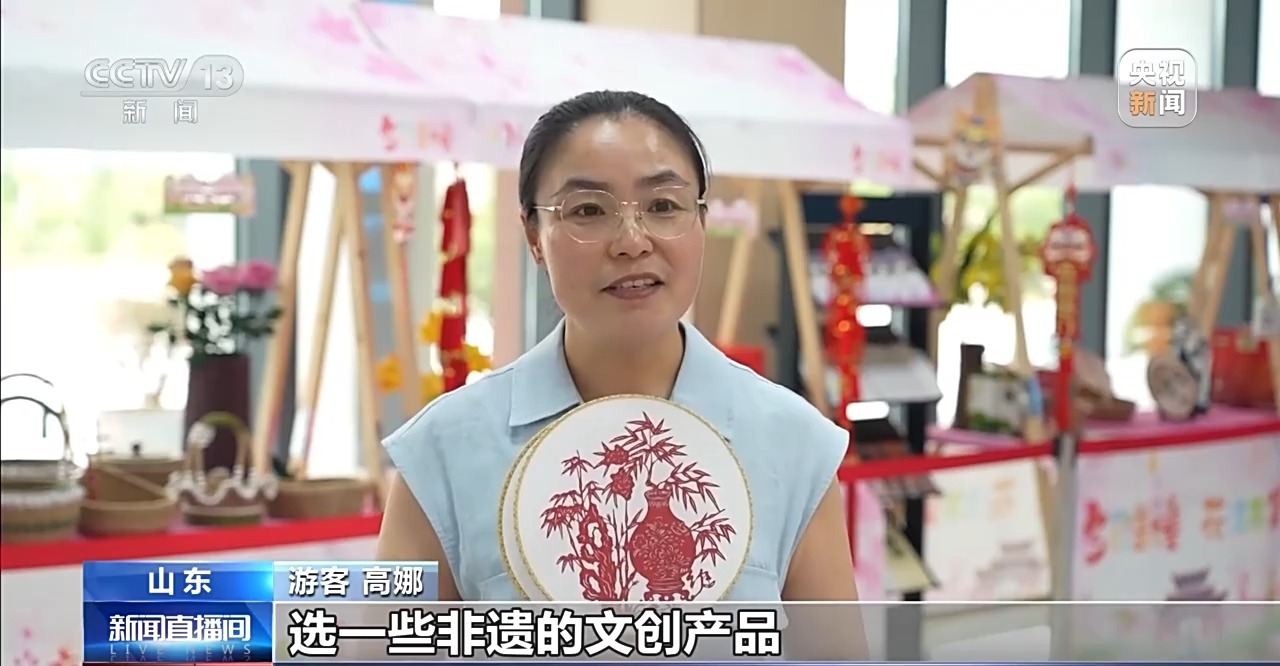 游客 高娜:經(jīng)常跟朋友們來這里逛一逛,選一些非遺的文創(chuàng)產(chǎn)品,今天選了幾把這個剪紙的折扇,特別喜歡。