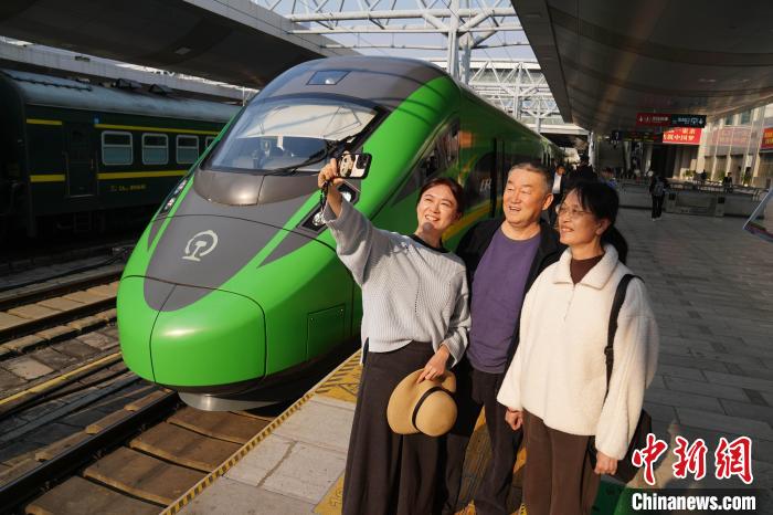 3月28日,中老鐵路第5000萬名旅客孫怡薇一家在列車前合影。中新社記者 劉冉陽 攝