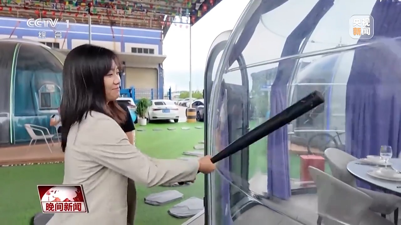“星空房”的墻面材質(zhì)只有4毫米厚。為了驗(yàn)證房屋強(qiáng)度,企業(yè)負(fù)責(zé)人請(qǐng)記者現(xiàn)場(chǎng)用鐵棒猛擊外墻。幾輪擊打過后,墻面毫發(fā)無(wú)傷,沒有出現(xiàn)任何裂痕。