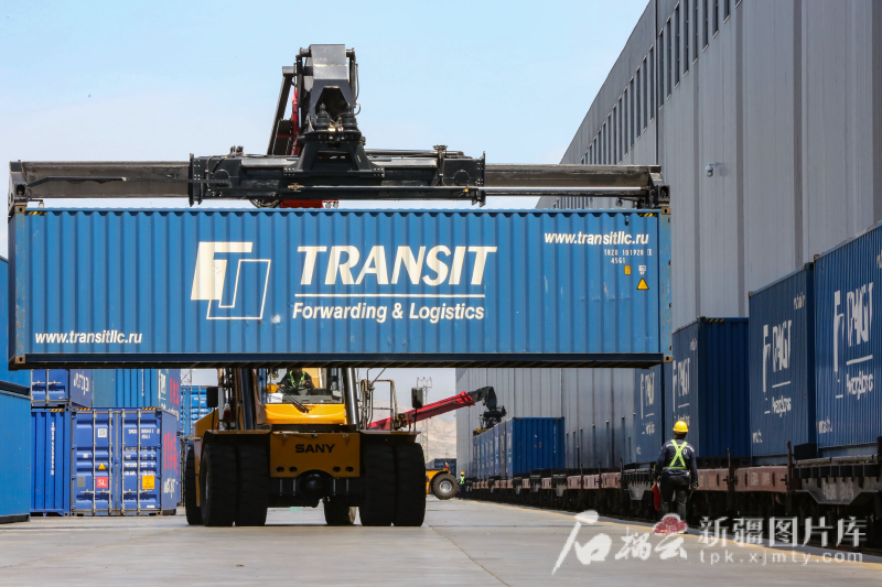 6月24日,阿拉山口站中歐(中亞)班列換裝區(qū)內的行車在吊裝集裝箱。蔡增樂 攝