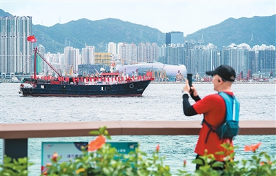 “今日難得天氣涼爽,跟太太一起出來感受下節(jié)日氣氛?!绷窒壬硎?,香港回歸祖國后,在國家支持下越來越好,特別是近幾年社會安定下來,沒有了無休止的爭吵,家人和鄰里關(guān)系也親密很多。他相信,只要人心齊,香港一定會更好。