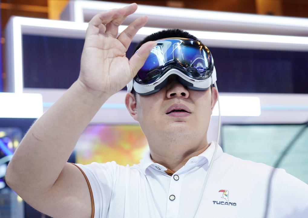 7月2日,參觀者在2025全球數(shù)字經(jīng)濟大會數(shù)字經(jīng)濟國際交流合作體驗區(qū)體驗一款MR混合現(xiàn)實設(shè)備。新華社記者 張晨霖 攝
