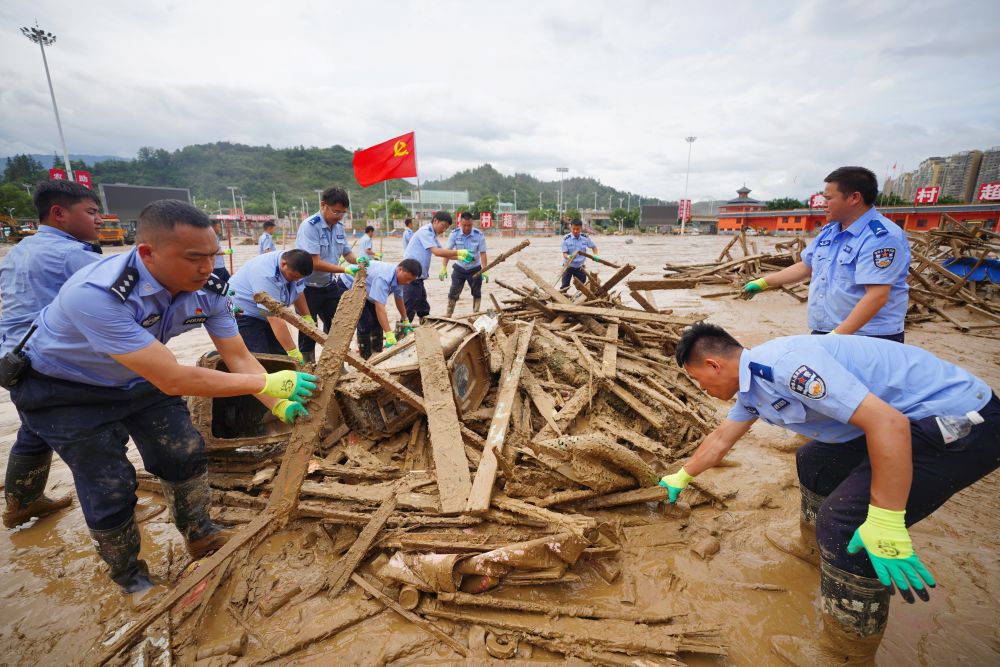 6月29日,在貴州省榕江縣“村超”球場,來自丹寨縣公安局的黨員民警潘建航(左二)和同事一起清理因洪災(zāi)受損的球場設(shè)施。新華社發(fā)(楊武魁攝)