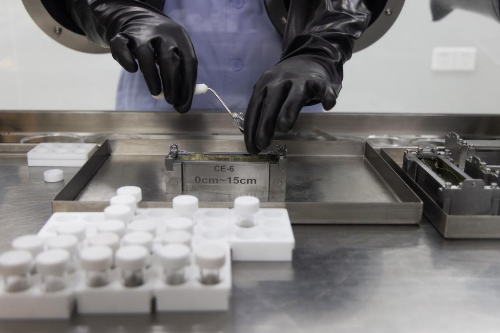 2024年9月24日,科研人員在月球樣品實(shí)驗(yàn)室的解封操作臺(tái)上處理嫦娥六號(hào)月球樣品。 新華社記者 金立旺 攝