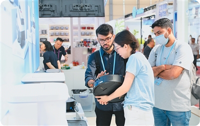 4月16日,客商在廣交會上了解掃地機器人產(chǎn)品。新華社記者 盧漢欣攝