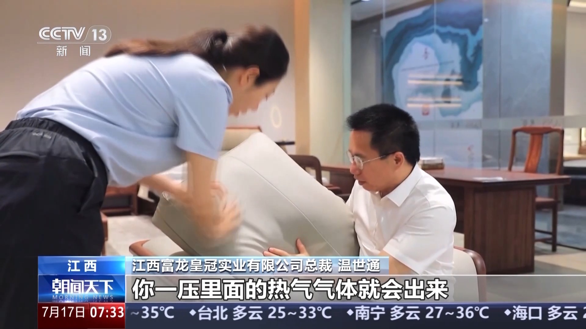 江西富龍皇冠實業(yè)有限公司總裁 溫世通:沙發(fā)靠墊后面我們?nèi)看蛄送笟饪祝粔豪锩娴臒釟鈿怏w就會出來,保證背部不會有很熱很燙的感覺,在銷售方面保持增長。