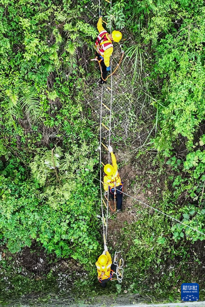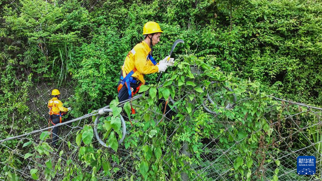 橋隧工人清除被動(dòng)網(wǎng)上的藤蔓和雜草(7月15日攝,無(wú)人機(jī)照片)。