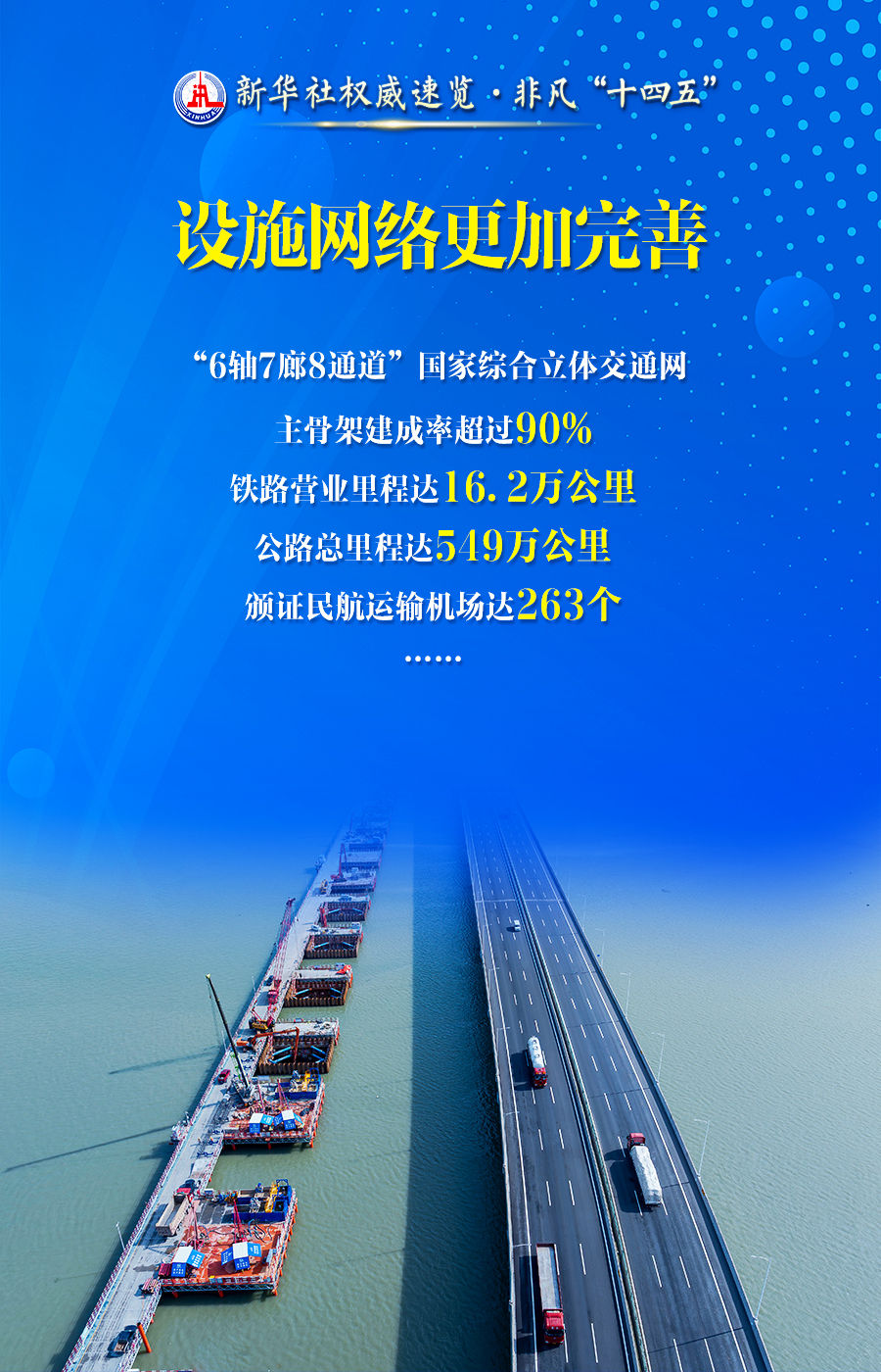 “十四五”時期,我國加快建設交通強國實現良好開局。在21日舉行的“高質量完成‘十四五’規(guī)劃”發(fā)布會上,交通運輸部部長劉偉說,這五年,我國交通運輸事業(yè)取得了歷史性成就,綜合交通運輸體系建設實現突破性進展。這組海報,帶你去看。