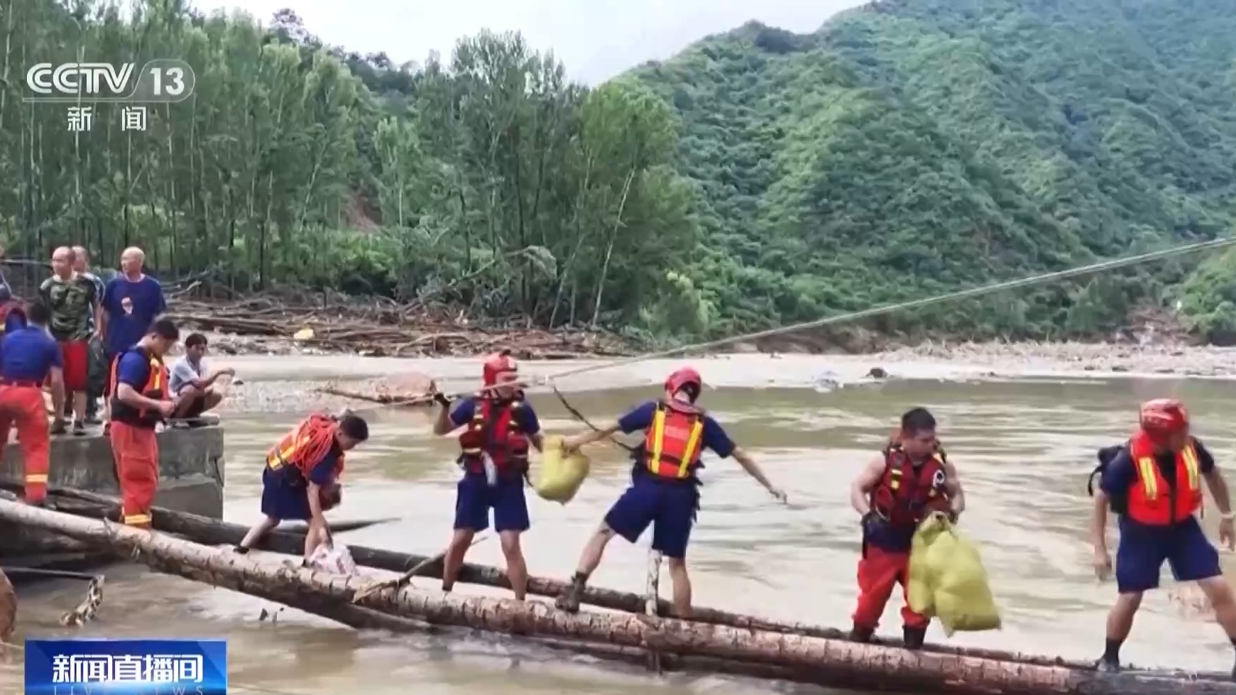 為了方便把受困人員轉(zhuǎn)移出來,消防救援人員在斷路處就地取材,用斷木和繩索快速架起一座木橋。