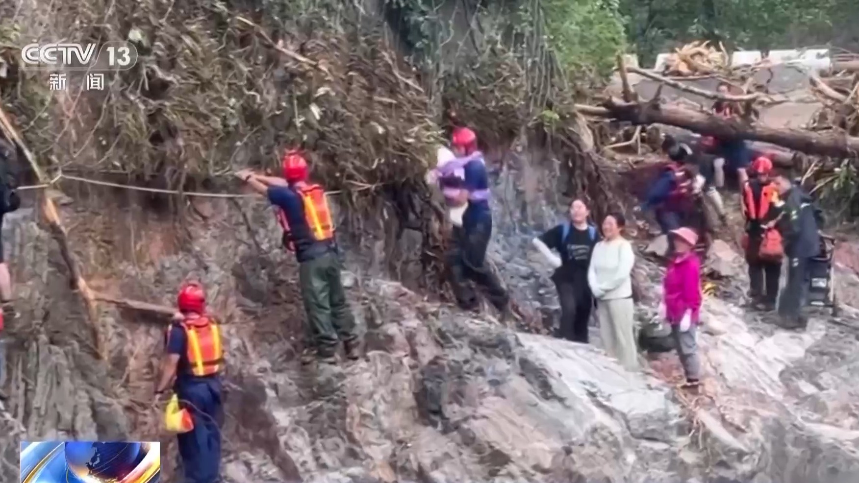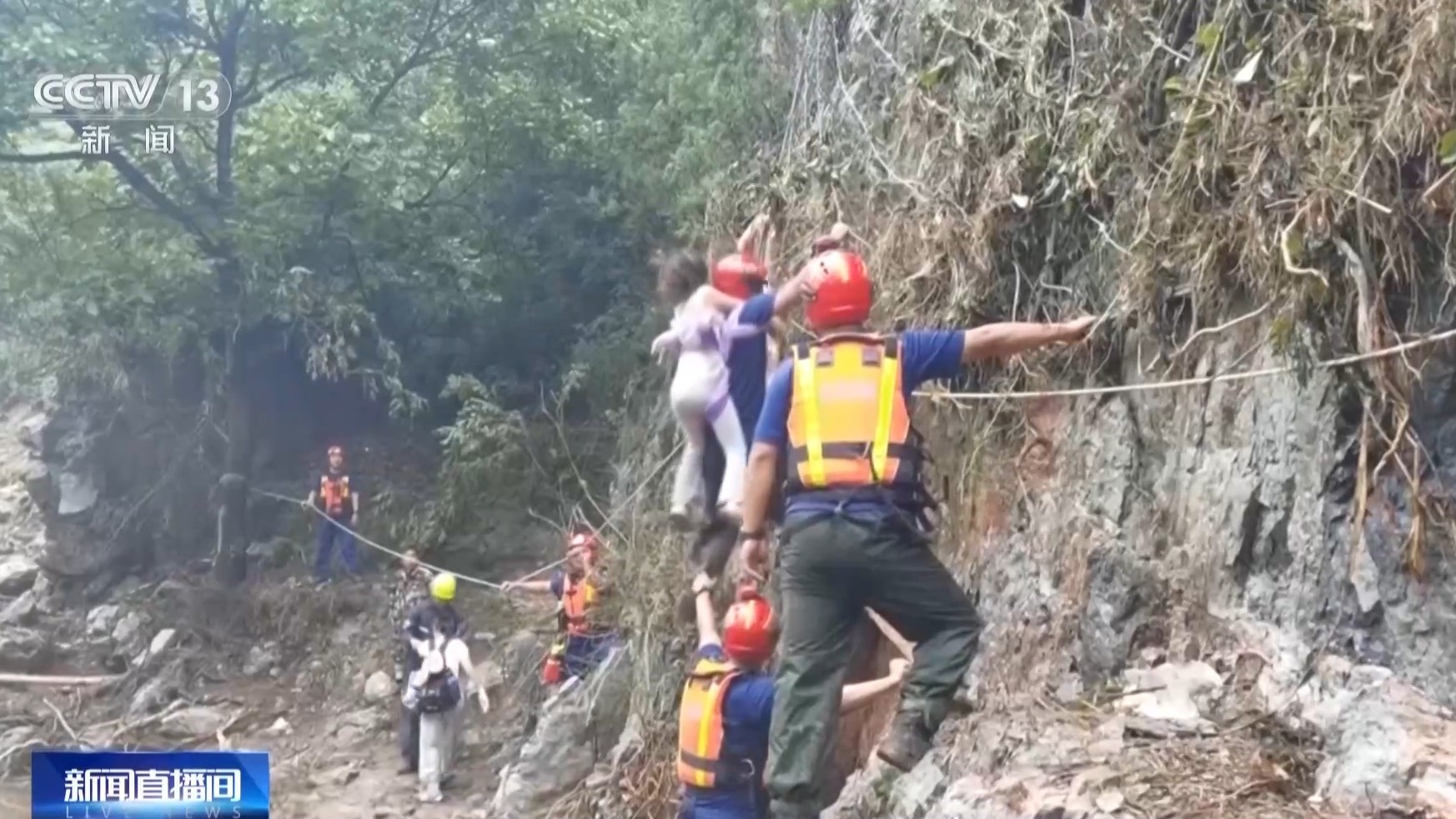 渡過斷橋還有斷路,這段路需要攀崖壁而行,隊員們拉起繩索,有自主行動能力的被困群眾,緊抓繩索,小心沿懸崖邊緣艱難通行;對于行動不便的老人、兒童和傷員,救援人員將他們一個個背負(fù)過險段。