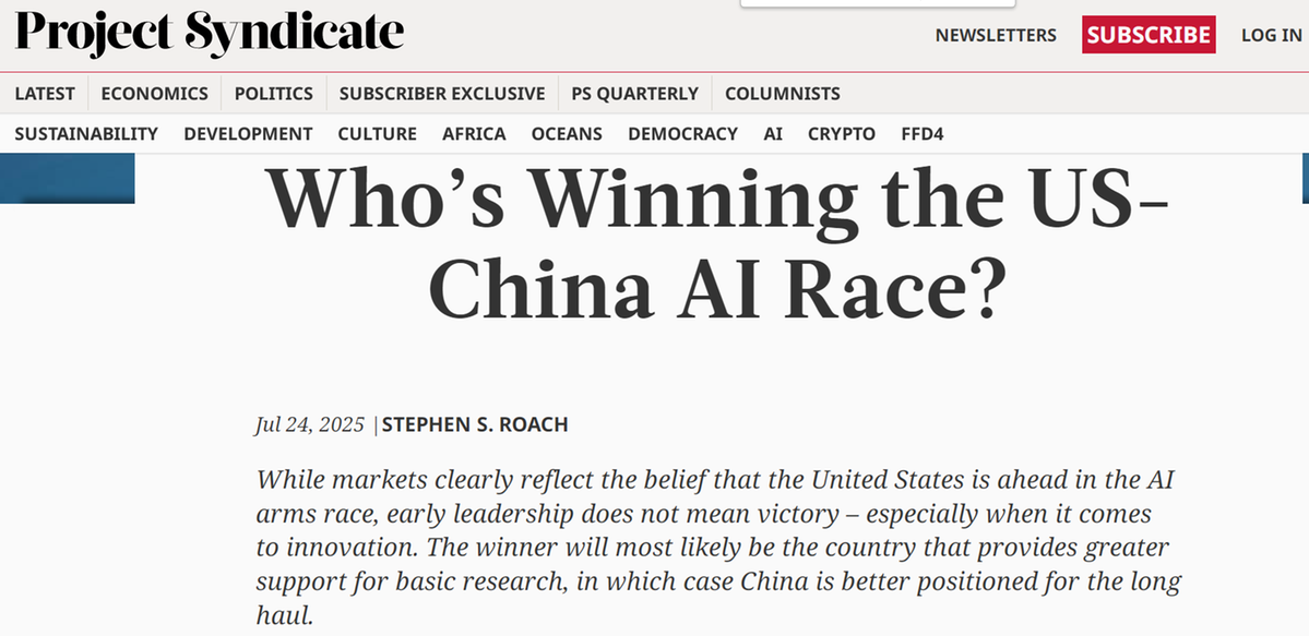美國摩根士丹利亞洲區(qū)前主席斯蒂芬·羅奇在報業(yè)辛迪加網(wǎng)站(Project Syndicate)發(fā)表文章指出,全球人工智能(AI)競賽的勝負取決于基礎研究的投入,而非短期市場表現(xiàn)。羅奇認為,中國憑借產業(yè)生態(tài)、研發(fā)投入和文化傳統(tǒng),使其在長期競爭中占據(jù)優(yōu)勢。
