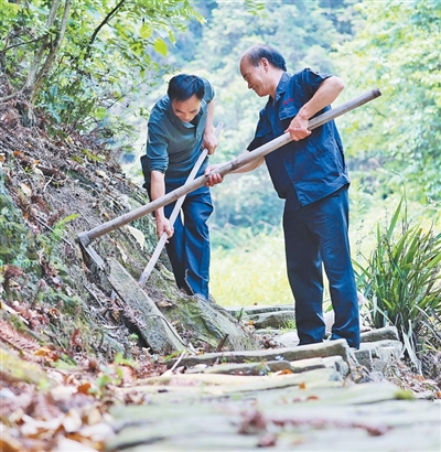 每次上山修路,陳興海和弟弟陳興合都會帶上鐵鍬、鎬頭、鋤頭、斧頭。“石頭硬得很,我一鎬頭下去,手震得疼!”這樣的日子,兄弟倆一過就是8年。總長約15公里的古道,已經(jīng)修好了約2/3?!拔覀冞€要繼續(xù)往下修?!标惻d海說。