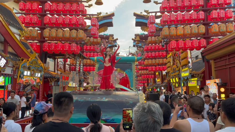在烏魯木齊市的天山明月城特色街區(qū),這里匯集了餐飲、休閑娛樂、歌舞演藝等業(yè)態(tài),每天都有各類演出活動,在豐富市民游客文化活動的同時,激發(fā)消費活力,助力“夜經(jīng)濟”發(fā)展。