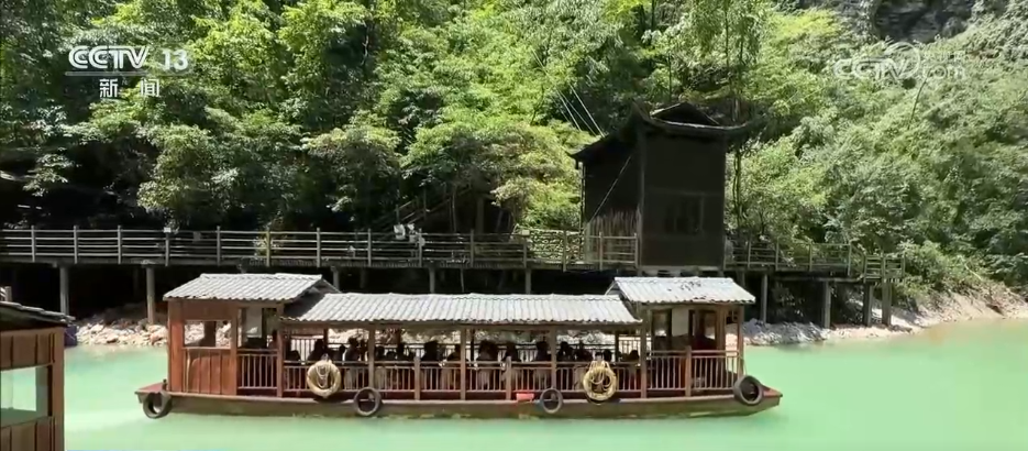 乘船賞景也成為景區(qū)一大特色,游客們乘坐游船緩緩穿梭于澄澈的湖面上,四周峽谷青山環(huán)抱,石壁瀑布傾瀉而下,兩岸景色蔚為壯觀。微風拂來,吹散夏日的燥熱,讓人沉浸在如詩如畫的美景中,心曠神怡。