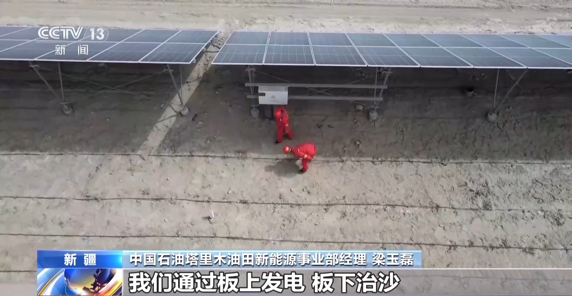 中國(guó)石油塔里木油田新能源事業(yè)部經(jīng)理 梁玉磊:我們通過(guò)板上發(fā)電、板下治沙,建設(shè)光伏方陣32個(gè),固沙面積達(dá)到4000畝。有效改變了小環(huán)境風(fēng)速,形成“發(fā)電-固沙-惠民”一體模式。