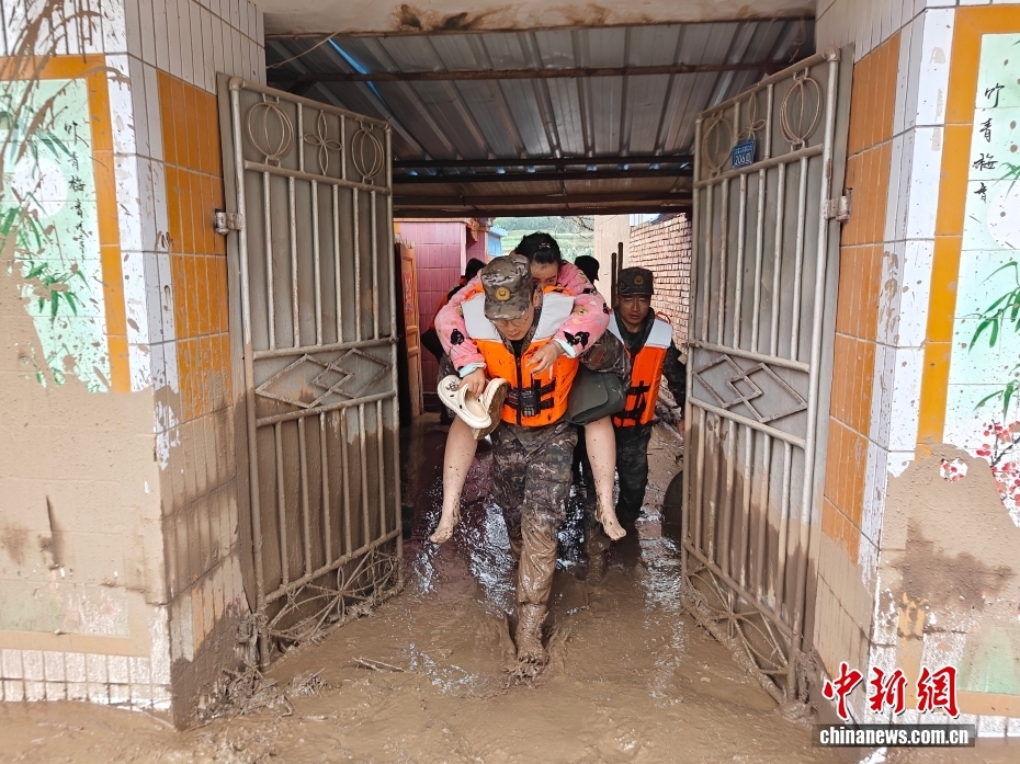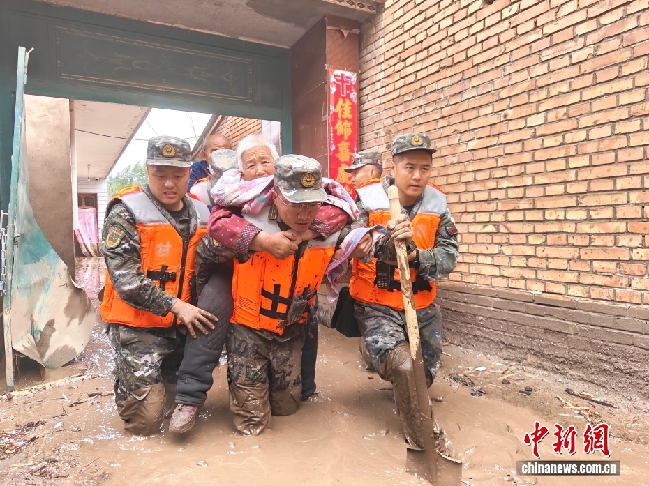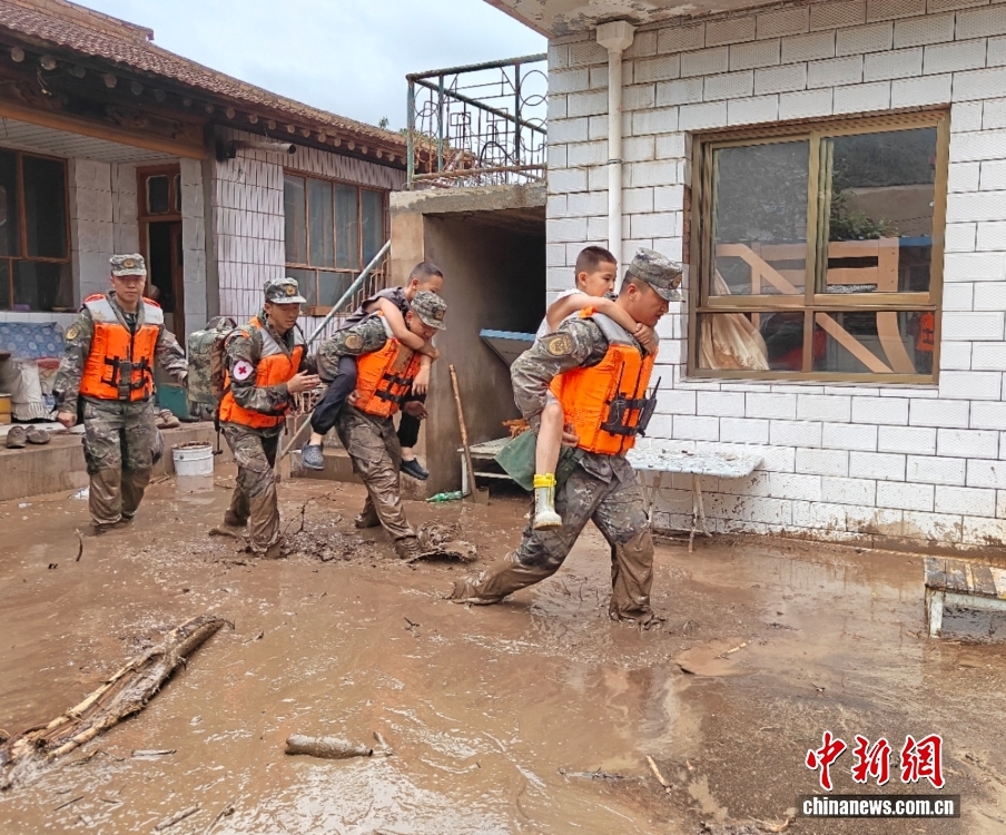 8月8日,武警甘肅總隊機動支隊官兵在甘肅省蘭州市榆中縣興隆山村轉(zhuǎn)移被困群眾。劉昆 攝