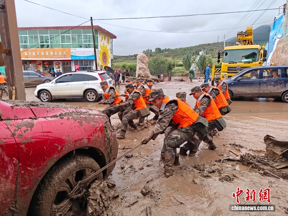 8月8日,武警甘肅總隊機動支隊官兵在甘肅省蘭州市榆中縣興隆山村轉(zhuǎn)移損壞車輛。劉昆 攝