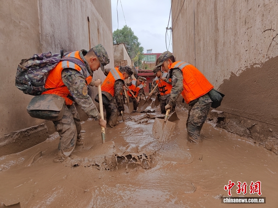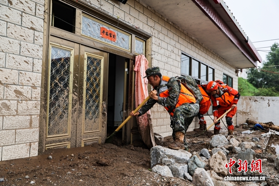 8月8日,武警甘肅總隊機動支隊官兵在甘肅省蘭州市榆中縣興隆山村清理淤泥。劉昆 攝