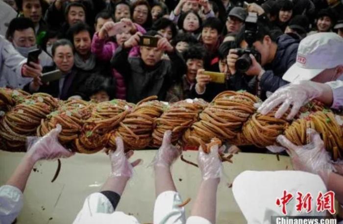11月18日,天津麻花文化節(jié)在天津意式風(fēng)情街桂發(fā)祥十八街麻花體驗(yàn)店舉行,消費(fèi)者共同分享了一支重118斤的巨型麻花