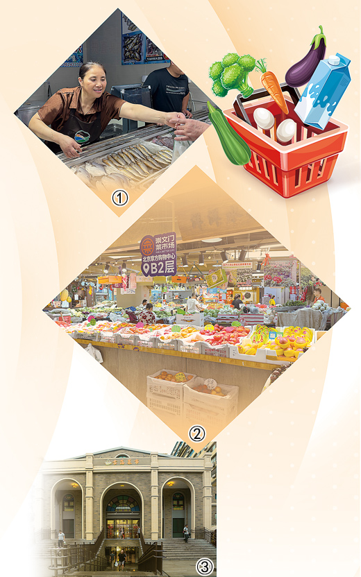 圖②:位于合景·摩方購物中心內(nèi)的新崇文門菜市場,貨架上各類水果、蔬菜琳瑯滿目。本報記者 李君強攝