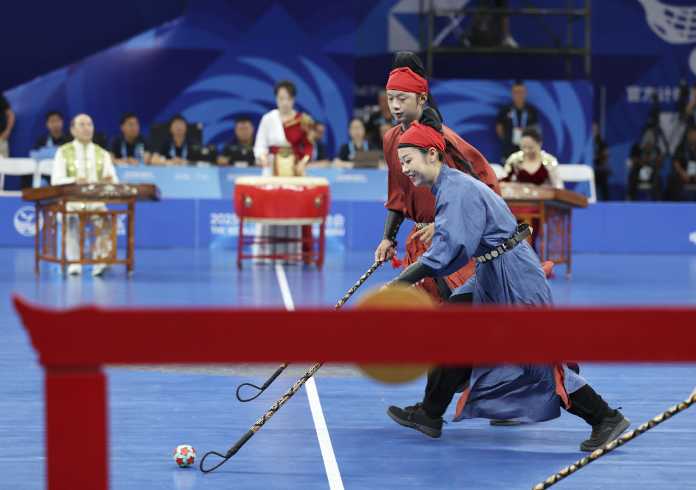 世運會不僅是競技的賽場,更是文明互鑒的窗口。8月6日,軟式曲棍球項目開賽。正式比賽之前,一場別開生面的“比賽”率先上演。循著鼓點、琴聲,演員們身著唐裝球衣競逐竹編彩球,一場金堂非遺步打球表演,將現(xiàn)場觀眾帶回到盛唐場景。