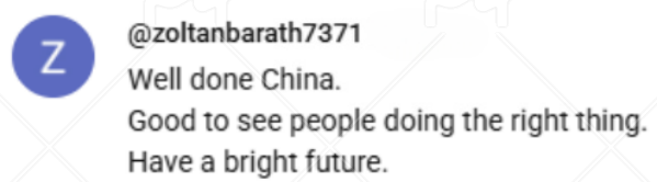 網(wǎng)友@zoltanbarath7371稱贊道,“干得好,中國。很高興看到人們在做正確的事情。祝愿中國未來一片光明?!?/p>
