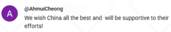 網(wǎng)友@Ahmuicheong祝愿道,“祝愿中國一切順利,支持他們的努力!”