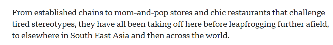 文章說(shuō),中國(guó)烹飪技藝源遠(yuǎn)流長(zhǎng)、博大精深,一桌美食盛宴或許正是中國(guó)最有效卻又最被低估的吸引力所在。還是以新加坡為例,商場(chǎng)、公交和地鐵站里,搭配著中國(guó)成語(yǔ)的中國(guó)美食巨幅亮眼廣告不時(shí)閃現(xiàn)。從連鎖巨頭到夫妻小店,再到顛覆刻板印象的時(shí)尚餐廳,這些中國(guó)美食品牌在向東南亞乃至全球擴(kuò)張前,都已在這個(gè)國(guó)際旅游城市嶄露頭角。