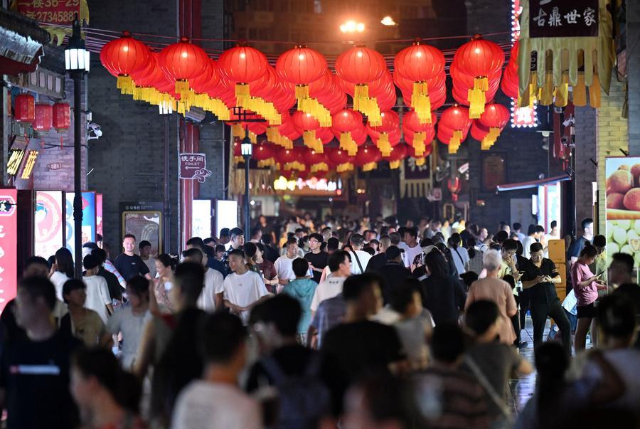 2025年8月3日,游客在天津古文化街游玩。新華社記者 趙子碩 攝