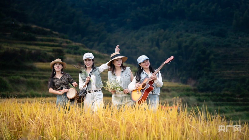 游客們手里的長槍短炮對準半山腰的梯田,咔嚓聲響個不停。航拍鏡頭下,沉甸甸的谷穗隨風搖曳。幾名熱愛音樂的游客在梯田中央彈起吉他,驚飛成群白鷺,雪白的翅膀掠過湛藍晴空。