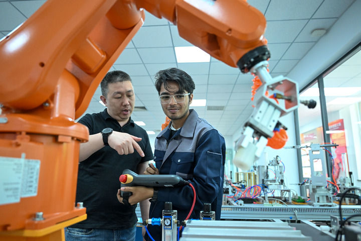 在天津現(xiàn)代職業(yè)技術(shù)學院魯班工坊實訓教室,教師指導學生操作設備(2025年6月16日攝)。