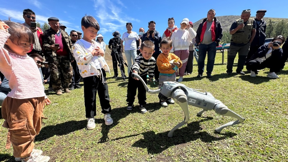 科普大篷車開進新疆阿勒泰青河縣套查干湖夏牧場,當?shù)匦∨笥押蜋C器狗互動。(新疆科技館供圖)