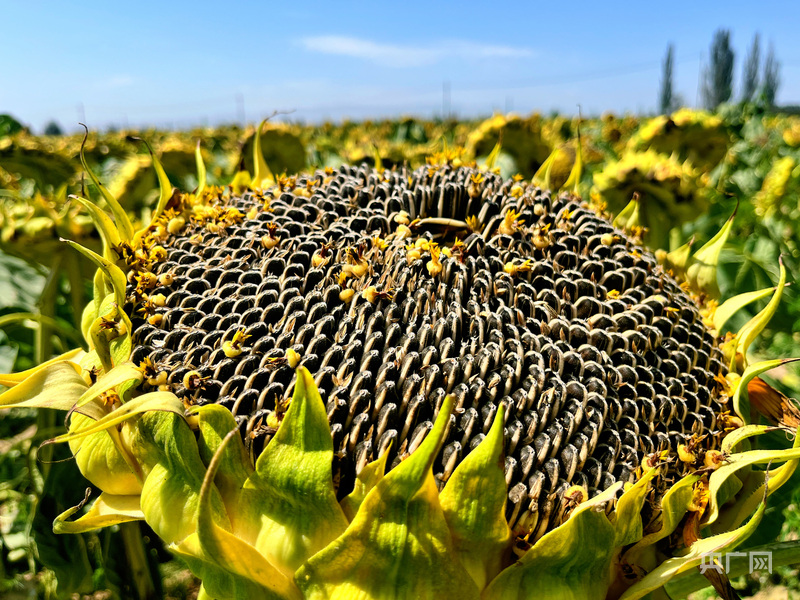 初秋時節(jié),內蒙古阿拉善盟阿拉善左旗溫都爾勒圖鎮(zhèn)巴潤霍德嘎查的1.3萬畝葵花迎來豐收。田間地頭,農戶們正忙碌地收割、插盤、晾曬,一片喜人景象。沉甸甸的葵花盤壓彎枝頭,顆粒飽滿、色澤金黃,不僅映襯出豐收的喜悅,更照亮了當?shù)厝罕娫鍪罩赂坏摹敖鹕贰薄?/p>