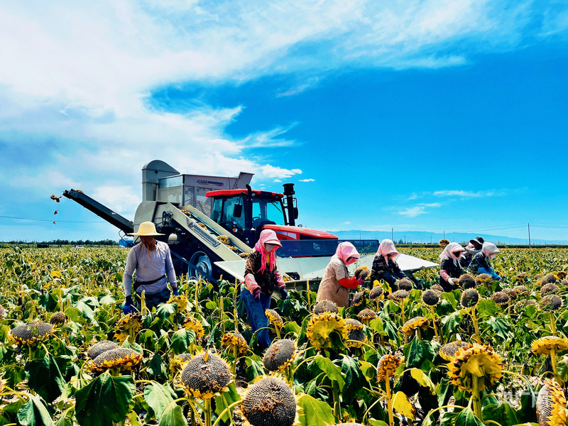 藍天白云下,農民們與農機協(xié)同,在向日葵田忙碌收獲(央廣網發(fā) 馬曉甜 攝)