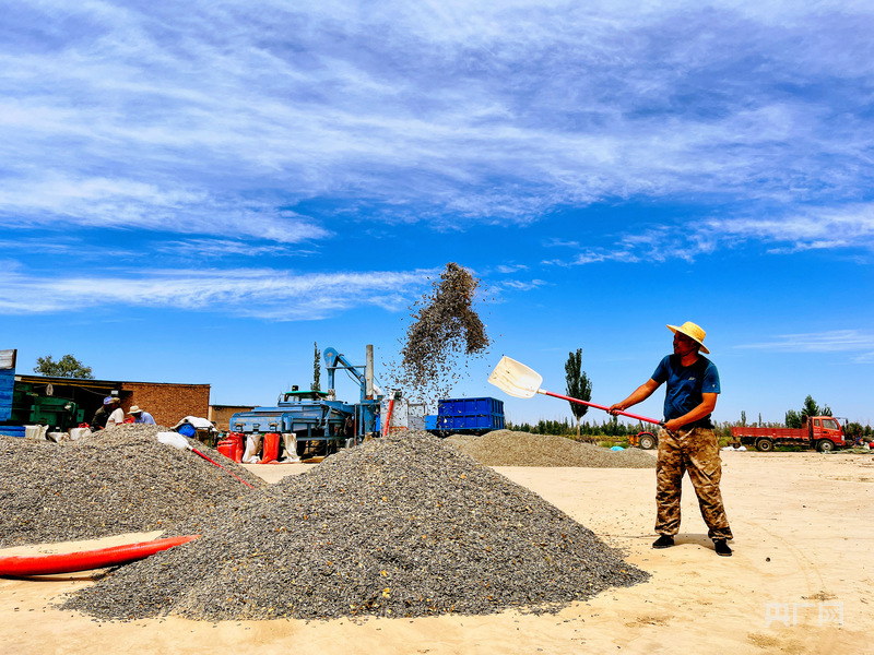 農民在藍天下奮力鏟揚作物,豐收的喜悅在堆場彌漫(央廣網發(fā) 徐曉瑤 攝)