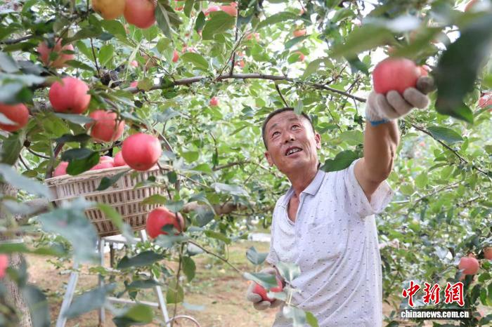 圖為陜西省延安市洛川縣的果農正在采摘早熟蘋果?!±钸M 攝