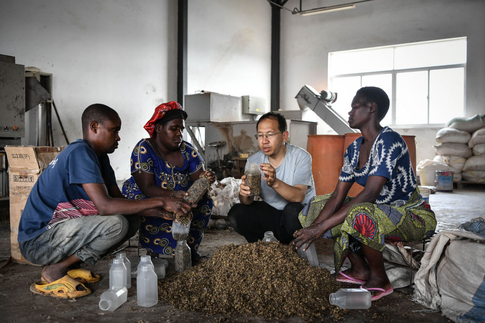 2024年8月13日,在盧旺達(dá)南方省胡耶區(qū)的中國(guó)援盧農(nóng)業(yè)技術(shù)示范中心,菌草專(zhuān)家陳曉斌(右二)與當(dāng)?shù)剞r(nóng)民一起制作菌種培養(yǎng)料。新華社記者 韓旭 攝