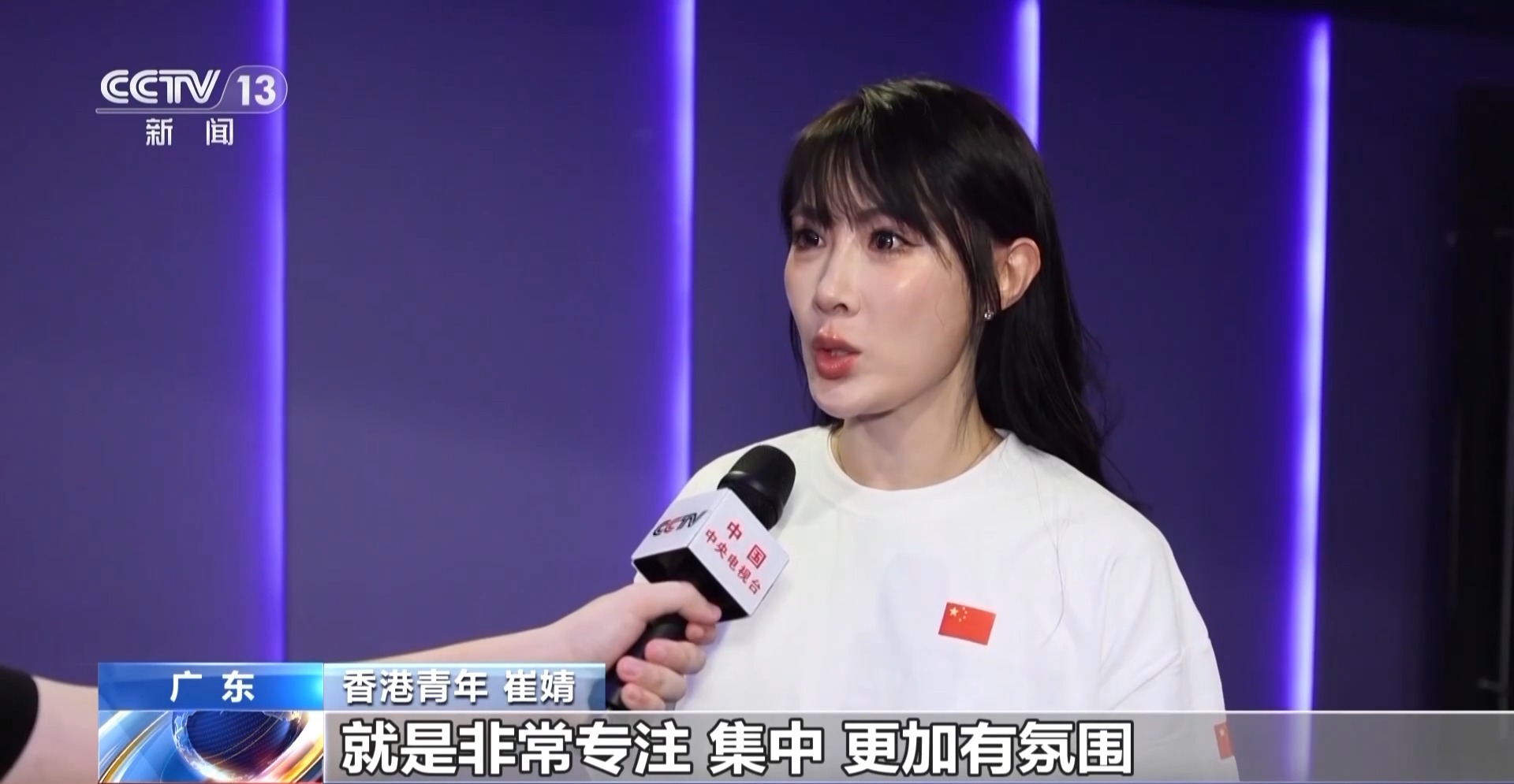 香港青年 崔婧:在電影院看,就是非常專注、集中,更加有氛圍,當(dāng)五星紅旗升起的那一刻,全場(chǎng)齊聲唱國(guó)歌,有熱淚盈眶的感覺,感覺到國(guó)家的團(tuán)結(jié)和力量。我看到了強(qiáng)大的海陸空軍隊(duì)陣容、先進(jìn)的現(xiàn)代化武器裝備,很震撼。我覺得國(guó)家的強(qiáng)大就是我們最大的底氣,希望祖國(guó)繁榮富強(qiáng)。