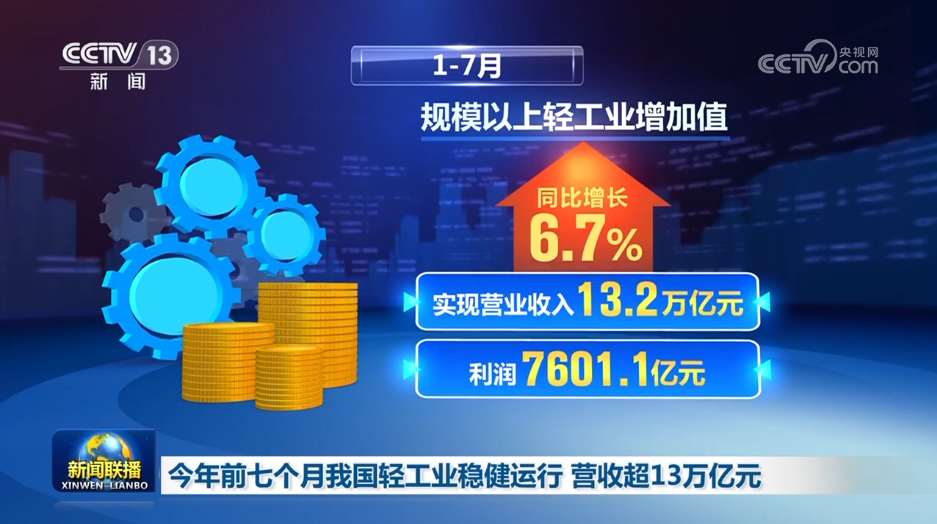 中國(guó)輕工業(yè)聯(lián)合會(huì)數(shù)據(jù)顯示,今年前七個(gè)月,在擴(kuò)內(nèi)需、促消費(fèi)政策支持下,我國(guó)輕工業(yè)運(yùn)行穩(wěn)健,生產(chǎn)、營(yíng)收、市場(chǎng)規(guī)模均保持良好態(tài)勢(shì)。規(guī)模以上輕工業(yè)增加值同比增長(zhǎng)6.7%,實(shí)現(xiàn)營(yíng)業(yè)收入13.2萬(wàn)億元、利潤(rùn)7601.1億元。