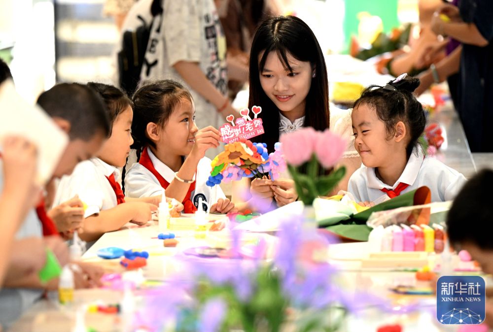 9月9日,在河北省石家莊市柏林莊學(xué)校開展的“黏土做花寄師恩”主題活動(dòng)中,孩子們用粘土制作花束,為老師送上節(jié)日的祝福。新華社發(fā)(陳其保攝)