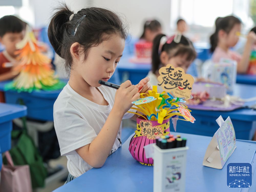 9月9日,河北省遵化市遵化鎮(zhèn)南關(guān)幼兒園的小朋友在繪制美術(shù)作品感念師恩。新華社發(fā)(劉滿倉攝)