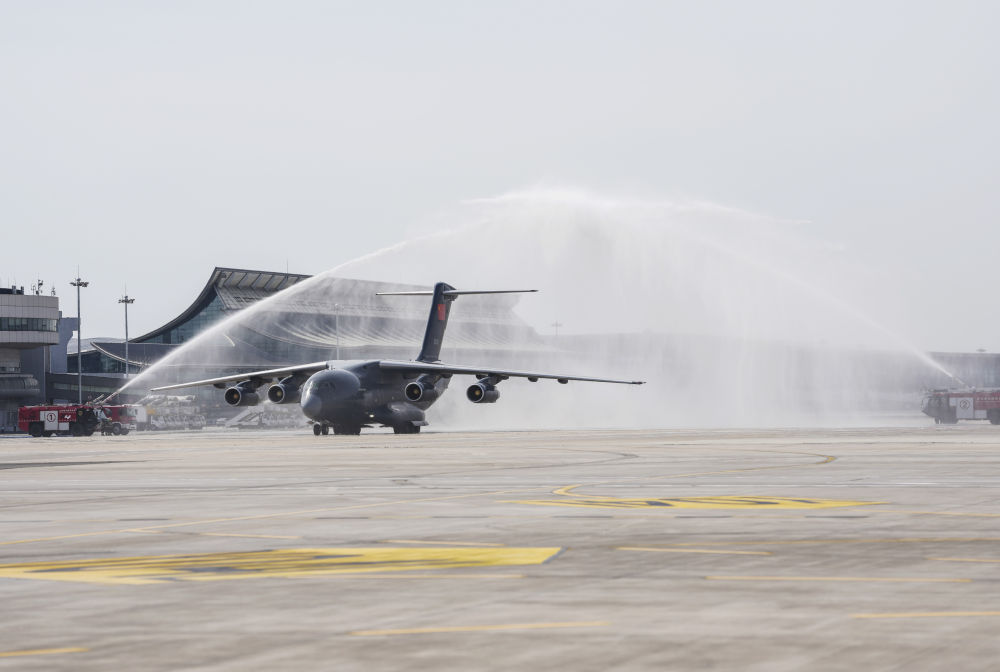 9月12日,第十二批在韓中國(guó)人民志愿軍烈士遺骸回國(guó)。這是在沈陽(yáng)桃仙國(guó)際機(jī)場(chǎng),接運(yùn)烈士遺骸回國(guó)的運(yùn)-20專機(jī)通過(guò)水門。新華社記者 潘昱龍 攝
