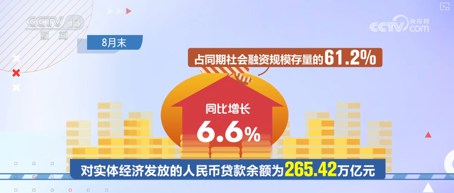 初步統(tǒng)計,8月末,社會融資規(guī)模存量為433.66萬億元,同比增長8.8%。其中,對實體經(jīng)濟(jì)發(fā)放的人民幣貸款余額為265.42萬億元,同比增長6.6%,占同期社會融資規(guī)模存量的61.2%。